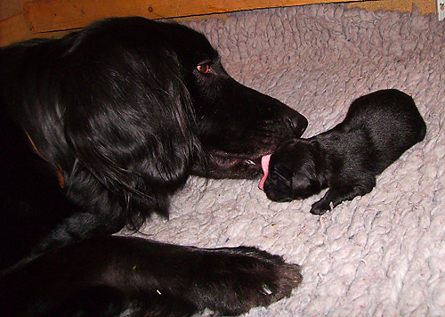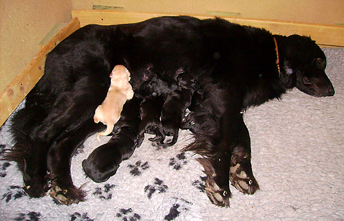 | Nach vierjähriger Zuchtpause gibt es wieder endlich wieder Welpen! Dorie brachte am 27.11.2008 3 schwarze Hündinnen, vier schwarze Rüden sowie einen Quoten-Blondschopf nach "Einstein vom Krinkelbach" zur Welt: